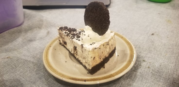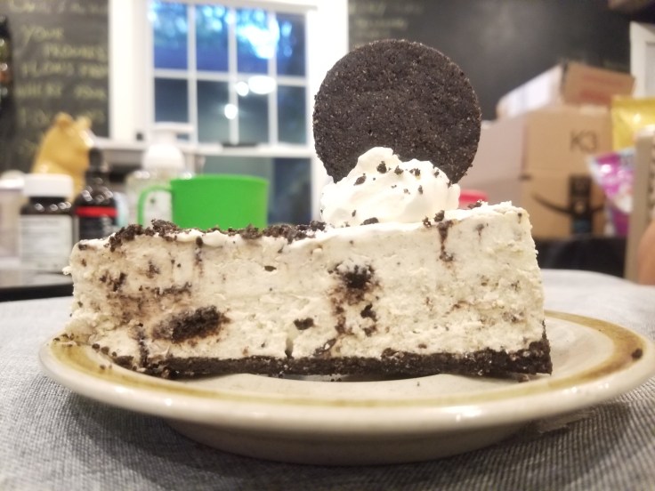 - Take the remaining crumbles and sprinkle them over the top of the cheesecake before slicing. If desired, you can take a little dollop of whipped cream and garnish with the remaining cookies to make it look fancy, but it’s totally optional if you’d rather just grab a fork and dig in!