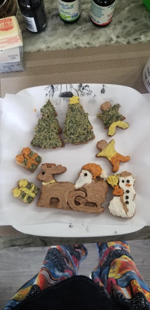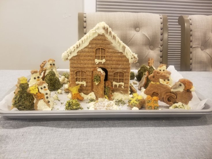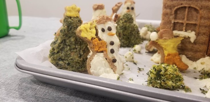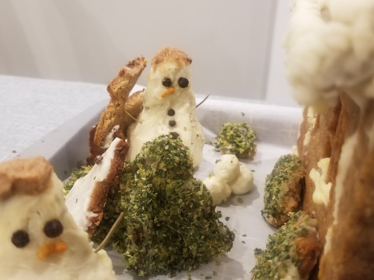 For the frosting, I mix 2 sticks of butter with 2 8 oz packages of softened cream cheese to make a soft icing. Feel free to start with 1/4 cup of powdered sugar and then keep adding more as needed until desired sweetness/texture. I add 1 cup of powdered sugar to make a really solid “glue” to connect the parts of the house together, and less for the icing, trim, and decorations, to have a more workable frosting that’s easier to pipe. Feel free to use food coloring as desired to make some fun, festive colors! We avoid food dye, so we decorated with using annatto flavoring for red coloring and dried, minced kale leaves for the green wreath decorations!