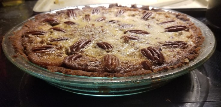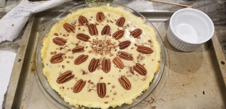 5. Cover the bottom of the crust with chopped pecans. Pour the caramel over the crust and cover the pecans. If desired, sprinkle more chopped pecans over the top or decorate with pecan halves. Cover the edges of the pan with a pie crust shield or aluminum foil, if desired, to prevent the edges from overbrowning.