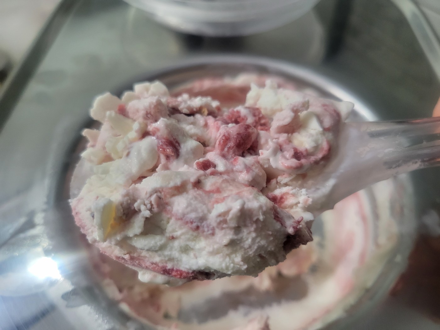 - Pour into the ice cream maker and churn according to the ice cream maker’s instructions. The batter will be very thick, so it won’t take long to set. When it looks like it’s only about 2 minutes away from being done, stream in the strawberry puree so you get those nice ribbons.