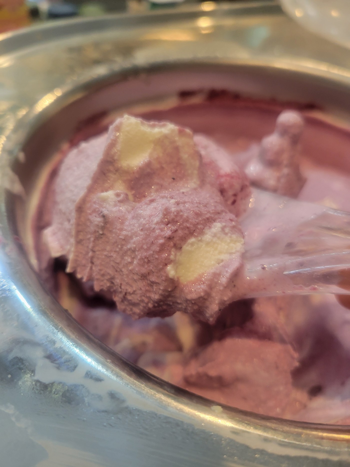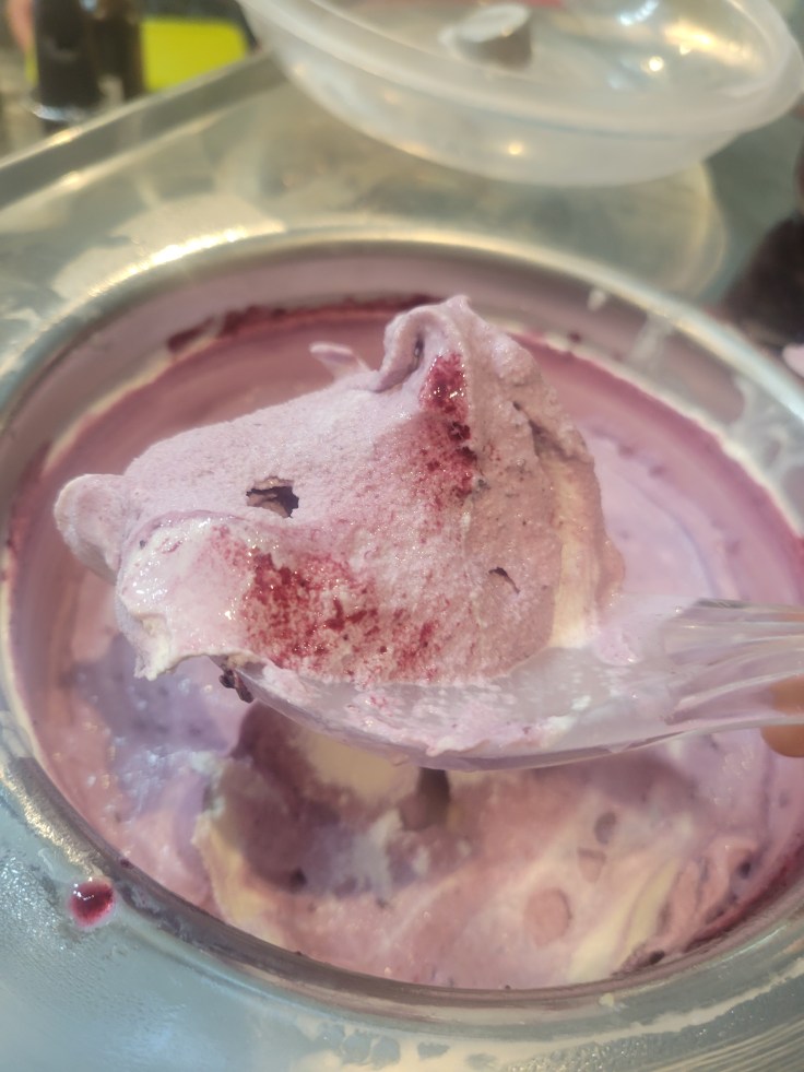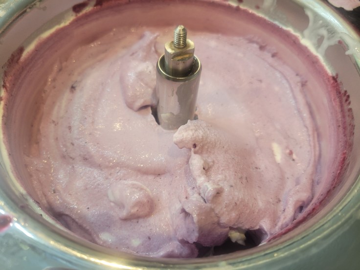 - Pour into the ice cream maker and churn according to the ice cream maker’s instructions. The batter will be very thick, so it won’t take long to set. When it looks like it’s only about 2 minutes away from being done, stream in the blueberry puree so you get those nice ribbons.