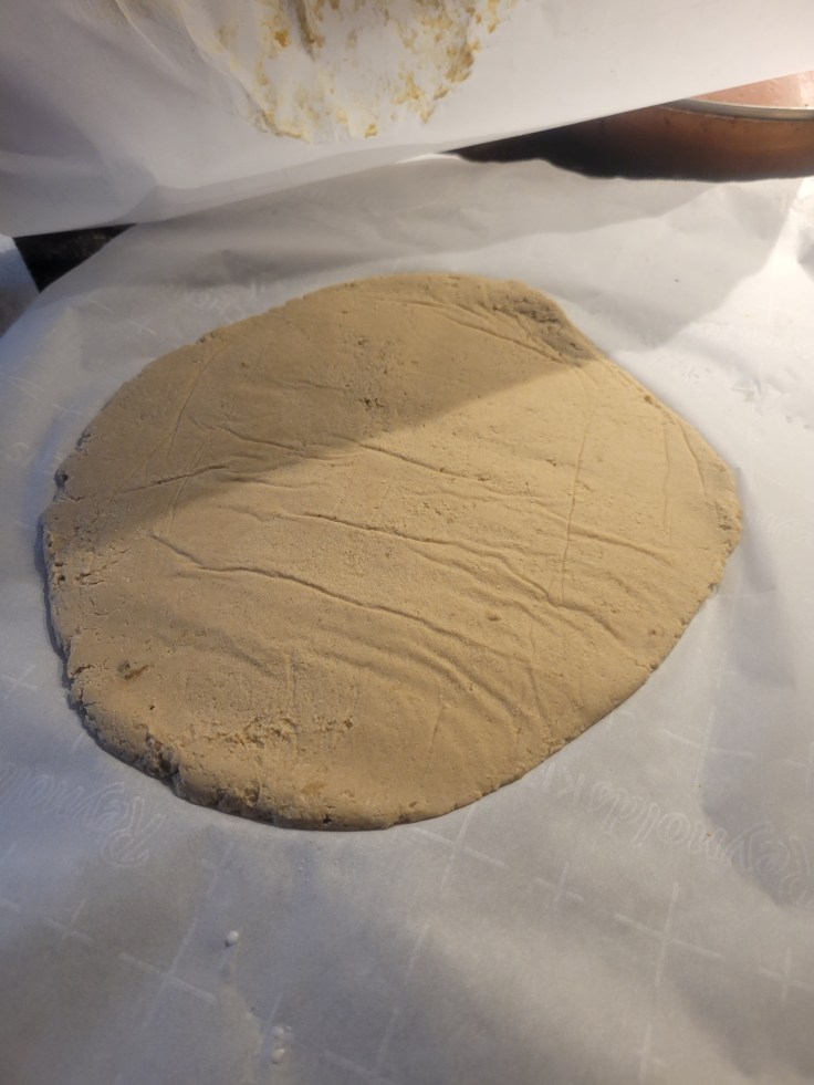 - 8. Wet your hands with water and gather the dough together into a ball. Put the dough on the parchment paper and then put the other piece of parchment paper on top of it. Roll out the dough until it is about a quarter-inch thick.