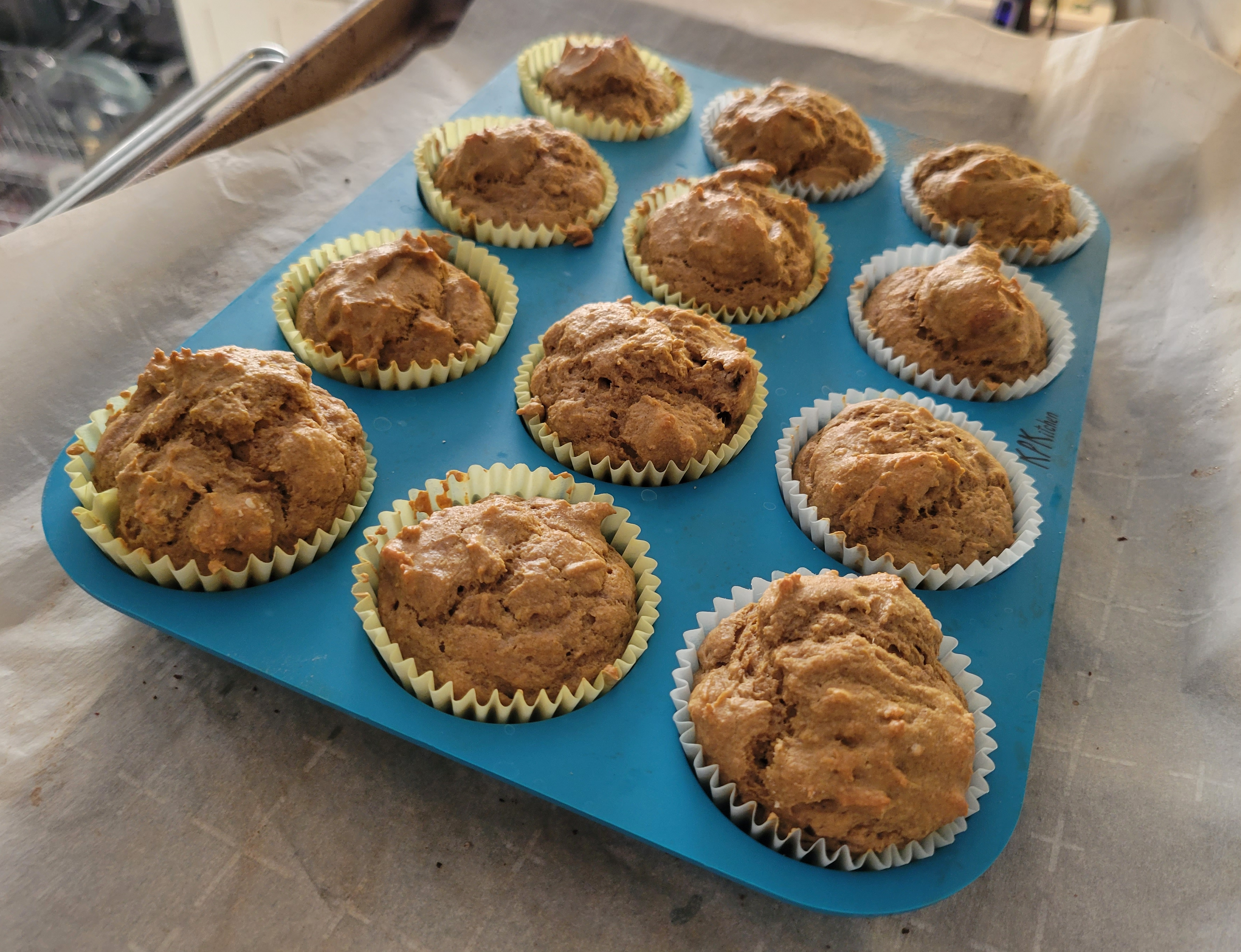5. Scoop the batter into your muffin tray. This should make 12 standard-sized muffins. Bake for 20 minutes at 350F. Your muffins may need more or less time, depending on your oven.
